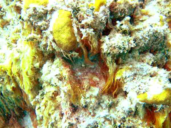 Figure 3 ---Dolphinarium fence ---- August 16 2003 The algae are concentrated in the southern part of the dolphin enclosure. There is a counter-current from the north to the south in this area. North of the Dolphinarium, one does not see algae. It is logical to deduce that the nutrients for the algae originate inside the dolphin enclosure. If you do not believe this, go in the water and see with your own eyes. If they think that what is illustrated here is a farce, they simply should go and snorkel or dive in the area and see with their own eyes. What is not counted should not be spoken of (Spanish saying). That seen in Chakanaab, is in general what will occur where they install future dolphinariums; it will happen in Paraiso, the Aquarium, or anyplace else. It is incredible that the Marine Park has approved a project in Paraiso, next to where the protected area began by Presidential Decree. How Much, and How, Does the Presence of the Alge Affect the Corals and Gorgonians? The corals and the gorgonians to the south of the Dolphinarium fence: We note that where the algae are propagating, to the south of the Dolphinarium, the corals are dead or dying. The gray parts of the photos WERE living coral surfaces; now the are dead, having lost their color. The diversity of species living around the corals has been reduced or finished. Now gray limestone structures predominate, created where before there were living corals. The competence or symbiosis between coral and algae is out of equilibrium as the consequence of the level of nutrients in the water; the presence and abundance of the algae confirms the presence of nutrients. the algae are finishing off the corals. EXAMPLES: