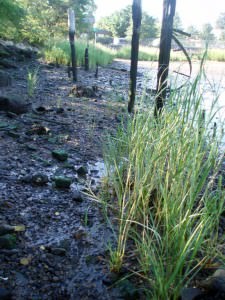 BIOROCK SPARTINA (FOREGROUND) AND CONTROLS (SPARSE PLANTS DOING POORLY IN THE MIDDLE) ARE PLANTED BELOW THE LOWER LIMIT OF NATURALLY REGENERATING SPARTINA (BACKGROUND).