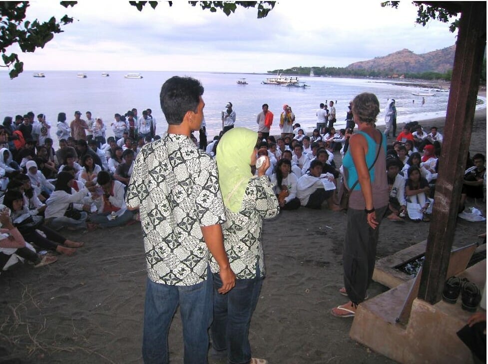Rani addressing 300 students in Indonesian, in front of Pemuteran Biorock projects